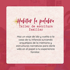 Haz un viaje de ida y vuelta a la casa de tu infancia surcando arquetipos de la memoria y estructuras narrativas para darle vida en el papel a tu experiencia familiar. INFORMACIÓN GENERAL Público: Personas sin conocimientos previos de literatura que quieran rescatar la memoria inmediata o histórica de su familia. Modalidad: Virtual Duración: 3 horas/ 1 sesión Inversión: 120 mil COP | 600 MXN OBJETIVOS Crea un relato de tu historia familiar Haz parte de la cartografía digital de la casa latinoamericana TEMARIO Primera parte: La casa 1. Formato: El diario 2. Tema: La voz que cuenta Segunda parte: Salir de casa 1. Formato: Crónica de viaje 2. Tema: El tiempo en la historia Tercera parte: Volver a casa 1. Formato: el relato 2. Tema: estructura narrativa RESULTADO O PRODUCTO: Relato de historia familiar y publicación en el cartorelato de La casa latinoamericana.